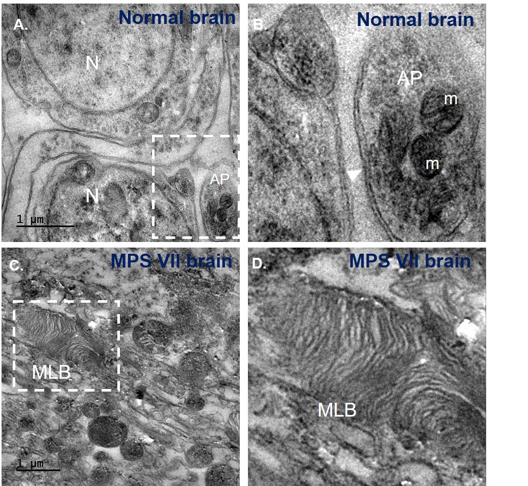 MPS VII is also a neuropathic disease, affecting cognition and neuromuscular coordination. About 80% of patients show neurodegenerative symptoms - intellectual disability, delayed speech, hearing loss, and restricted movement 1. Neuropathological studies have revealed GAG accumulation, brain vacuolation, and skull enlargement - a system slowly collapsing under its own burden 5,6.