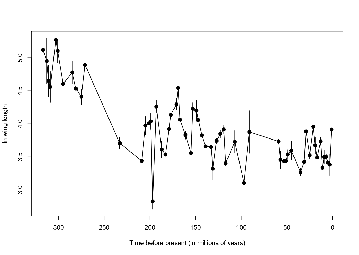 In the Cenozoic despite values being relatively high and temperature dropping to levels lower than the average in Mesozoic there is no real response in body size of insects. Predation pressure can play a big role in the evolution of a lineage.