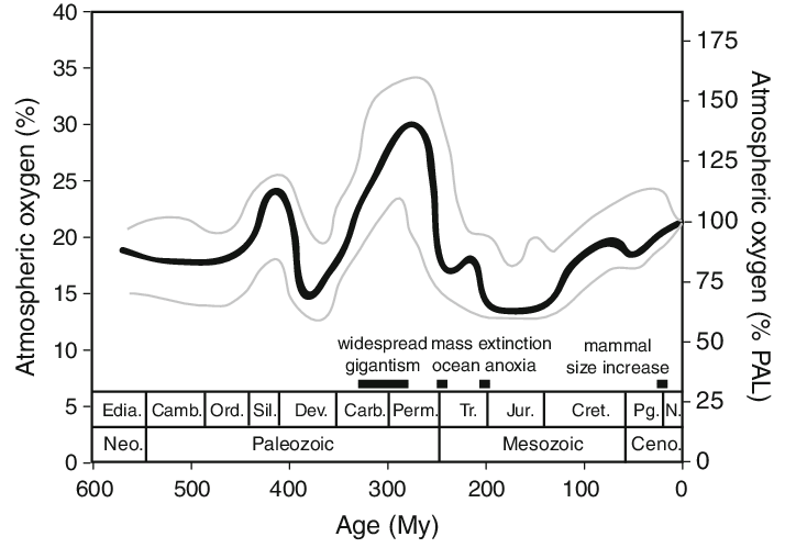 For an abnormally large insect to not suffocate, there needs to be an abnormally high amount of oxygen in the air. Luckily in the Carboniferous, oxygen content was in fact very high, 35% to be precise. If we look at p concentration throughout the Phanerozoic, the Carboniferous is the point of highest content. Coincidentally it would seem that the largest insect sizes were attained at this time.