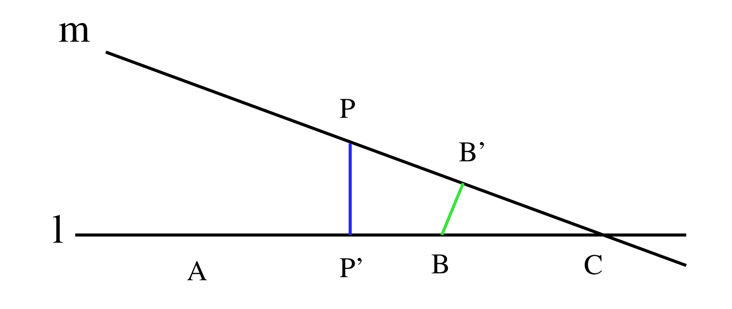 Proof. Let be a line in the plane, such that it passes through points in the plane, and there exists some point in the plane, whose perpendicular distance to is the minimal perpendicular distance between any point-line pair in the plane. Note that since we have an arrangement of a finite number of points (in the set P) in our plane, the set of lines determined by the points in P is also finite.